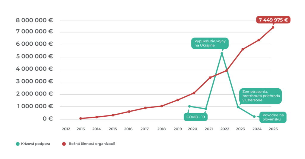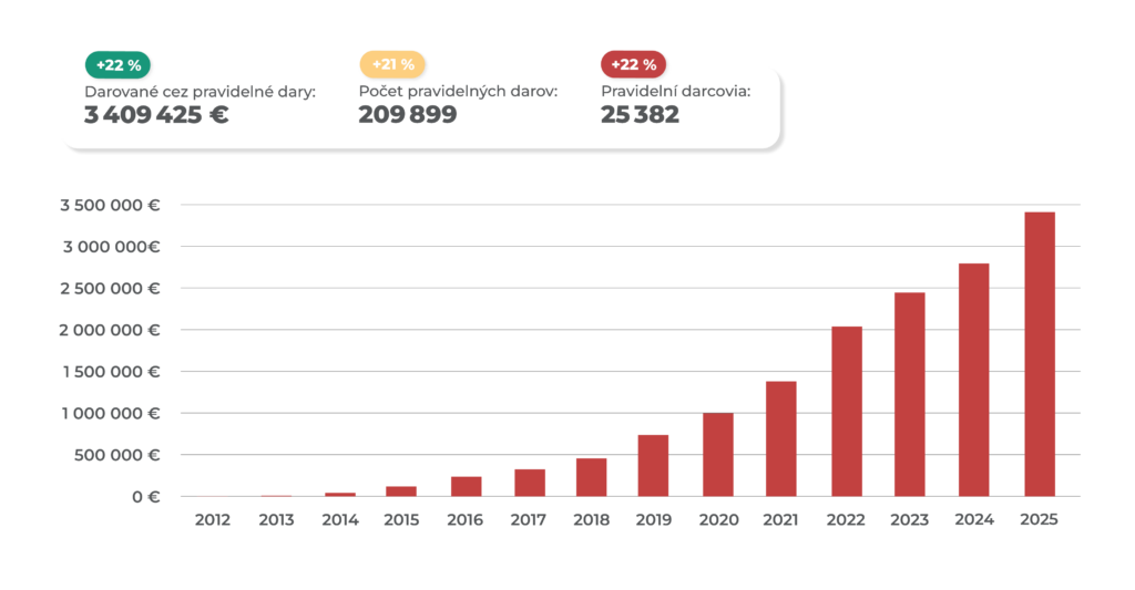 Aj bez výraznej krízovej udalosti sa celková suma darov medziročne zvýšila o 12 %. Znamená to, že darcovia sú pripravení podporovať organizácie dlhodobo a systematicky, ak majú jednoduchý a dôveryhodný spôsob, ako to urobiť.