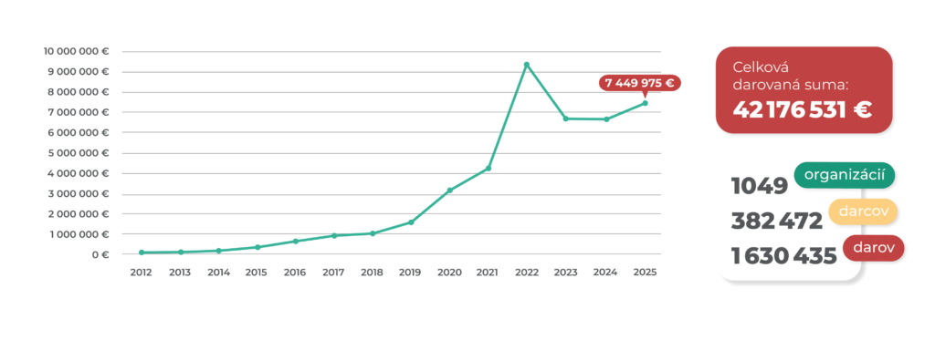 DARUJME.sk dnes využíva viac ako 1 000 organizácií a za 13 rokov sa cez systém podarilo získať viac ako 42 miliónov eur na verejnoprospešné aktivity.