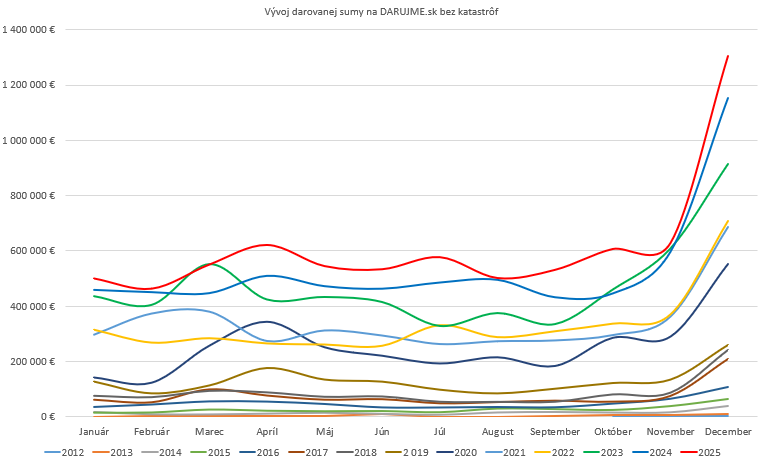 Čísla nám v DARUJME.sk hovoria jasne. Mesiace marec a apríl sú, čo sa darovanej sumy týka, najúspešnejšími v prvej polovici kalendárneho roka. A to dlhodobo! Pozrite sa na graf nižšie s údajmi o bežnom darovaní počas roka – odpočítali sme výrazné nárazové dary (pomoc pri tornáde na Morave, výbuch v Libanone, vojna na Ukrajine, zemetrasenia v Turecku, Sýrii a Maroku či zničenie priehrady na Ukrajine).